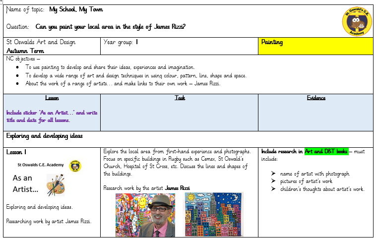 Every Year group has a session planner for each project to ensure clear topic links and balanced spiral coverage of Art aspects.