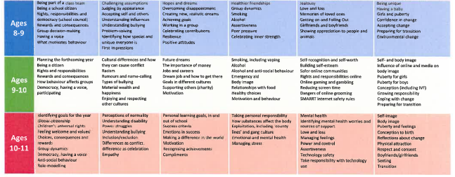 Includes drugs and alcohol education, self-esteem and confidence as well as healthy lifestyle choices.