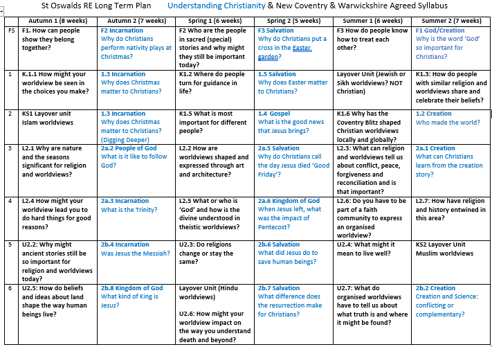 The RE Long-Term Plan contains a mixture between the Understanding Christianity scheme of work and the Coventry and Warwickshire Religion & Worldviews agreed syllabus. This gives our pupils the opportunity to understand people’s beliefs, compare them with their own and learn to respect each other’s worldviews and faith.