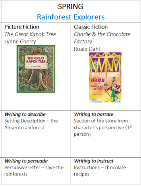 This term, we will be looking at the text ‘The great kapok tree’ with the end of unit outcome writing focus of writing a setting description on the rainforest. We will also be writing a persuasive letter to explain why we should save the rainforest.  In the second half term, we will be looking at the text ‘Charlie & the Chocolate Factory’ and writing a 1st person narrative from a character’s perspective. We will also be writing instructions for a recipe for making chocolate.
