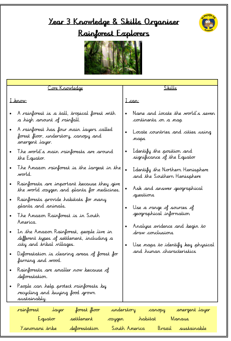 Our history unit for this term will be Rainforest Explorers! Children will be learning about the layers of the rainforest, where rainforests are found in the world and what daily life is like.