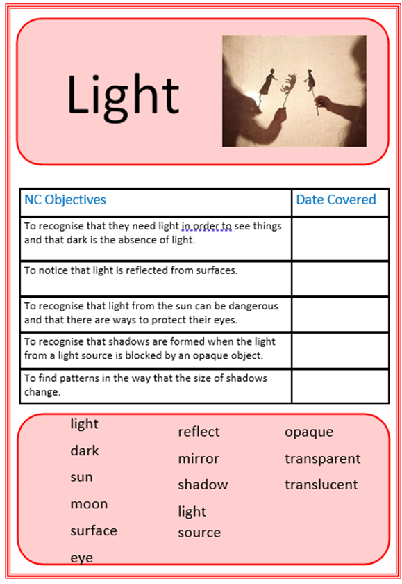 During this term, we will be learning about light. In this unit, children will be identifying light sources and working scientifically to understand which objects are good light reflectors. In Spring 2, children will learn about Forces and Magnets.